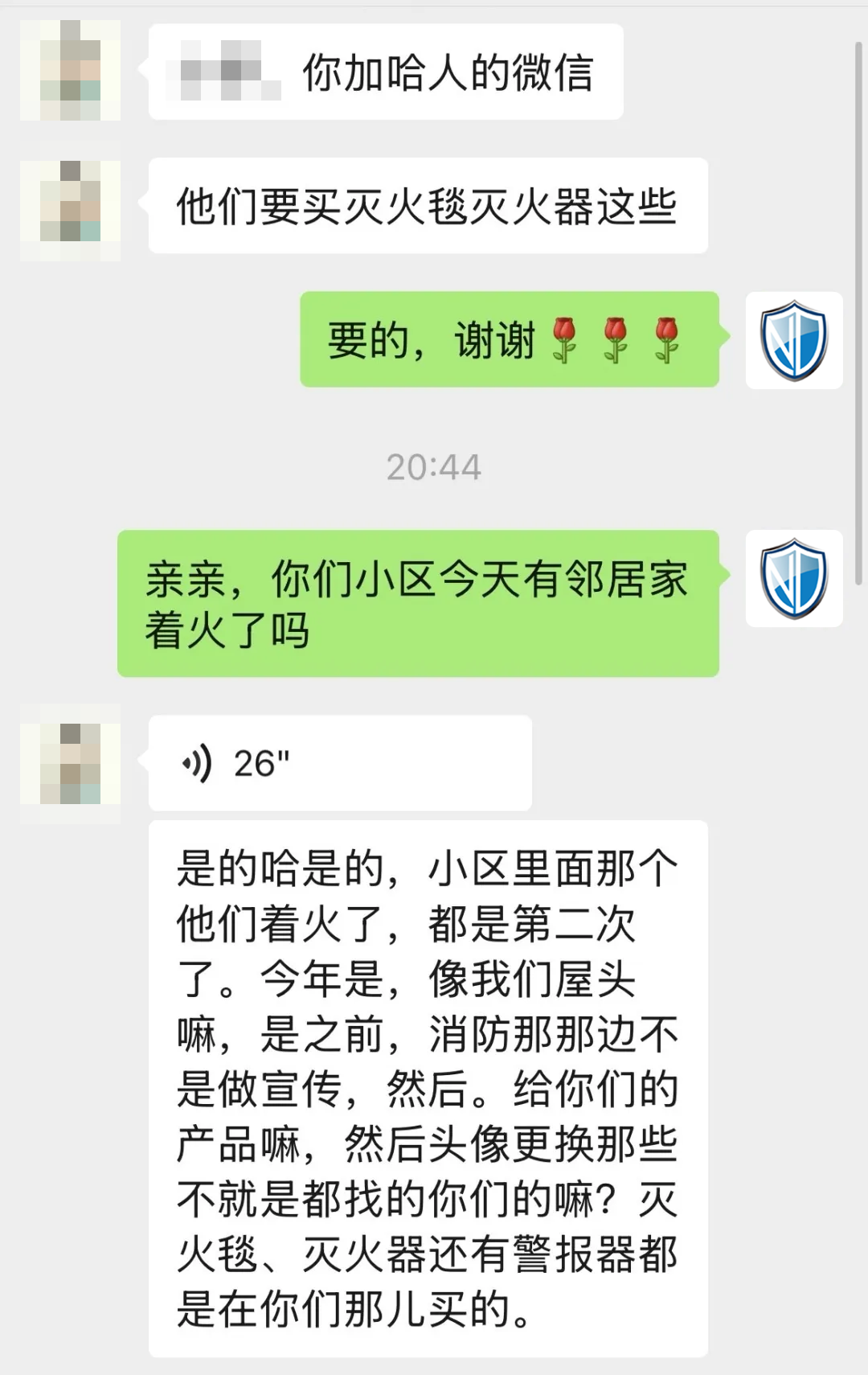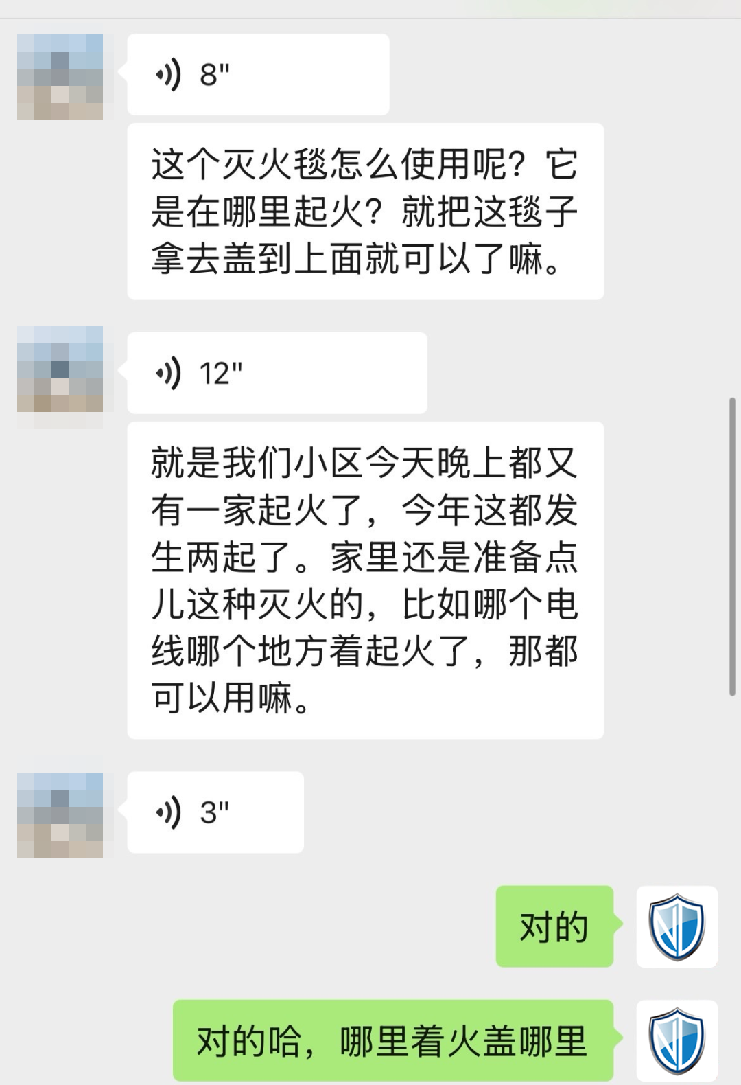 劉女士的分享很快引起了鄰居們的關(guān)注。王女士(化名)是第一個(gè)聯(lián)系安康諾盾客服的:“今年小區(qū)都發(fā)生兩起火災(zāi)了,家里還是準(zhǔn)備點(diǎn)滅火的器材,萬一發(fā)生火災(zāi)還能用上,聽了劉女士的介紹,立馬下單了一套。”